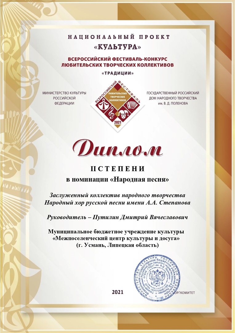 Жюри Всероссийского фестиваля-конкурса любительских творческих коллективов по достоинству оценён заслуженный коллектив народного творчества народный хор русской песни имени А.А. Степанова межпоселенческого центра культуры и досуга (г. Усмань), руководитель заслуженный работник культуры Липецкой области Дмитрий Вячеславович Путилин.