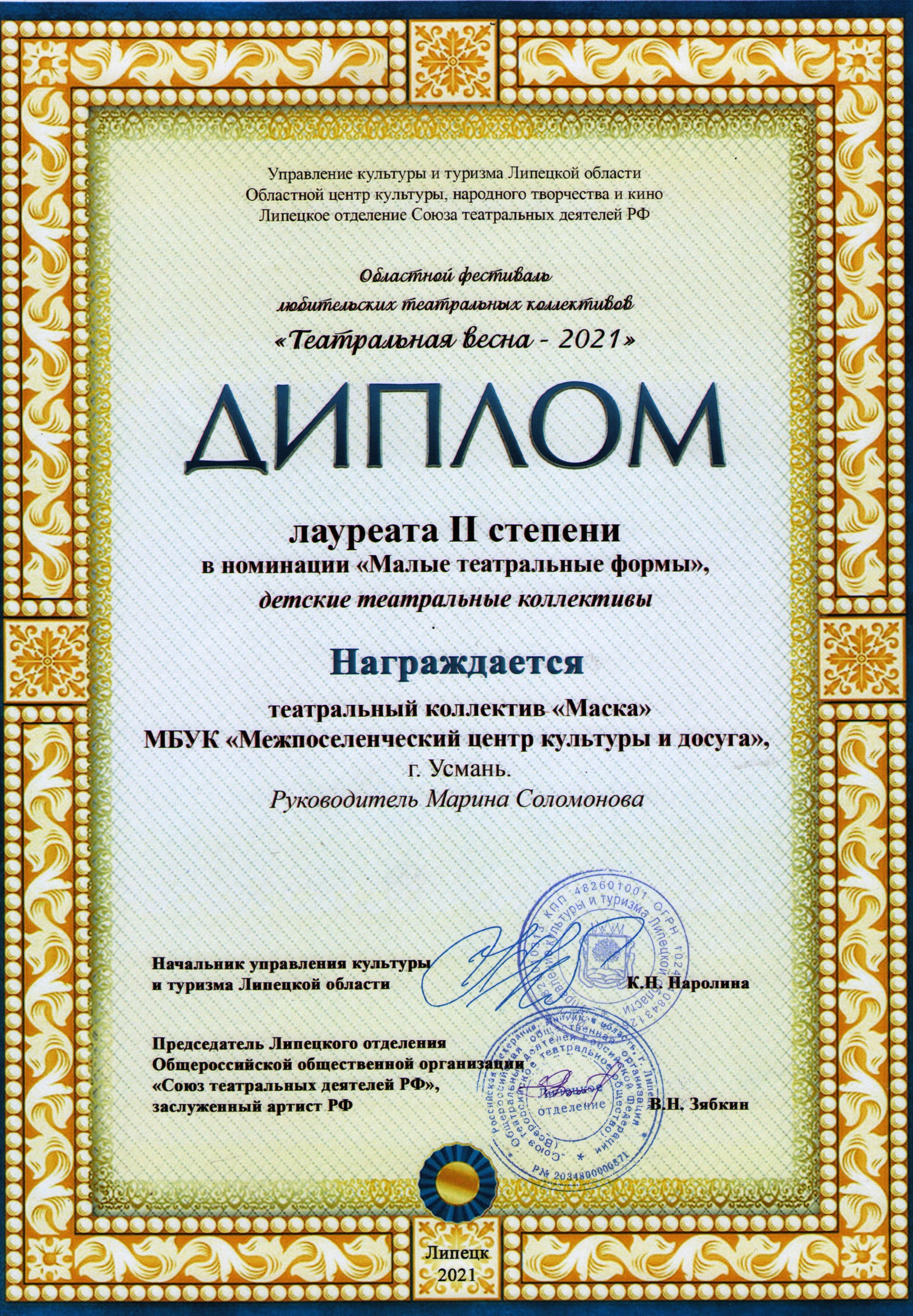 22 апреля 2021 года в Областном центре культуры, народного творчества и кино состоялось подведение итогов областного фестиваля любительских театральных коллективов "Театральная весна - 2021". ДИПЛОМОМ ЛАУРЕАТА II СТЕПЕНИ В НОМИНАЦИИ "МАЛЫЕ ТЕАТРАЛЬНЫЕ ФОРМЫ" (детские театральные коллективы) - награжден ТЕАТРАЛЬНЫЙ КОЛЛЕКТИВ "МАСКА" - рук. Марина Соломонова